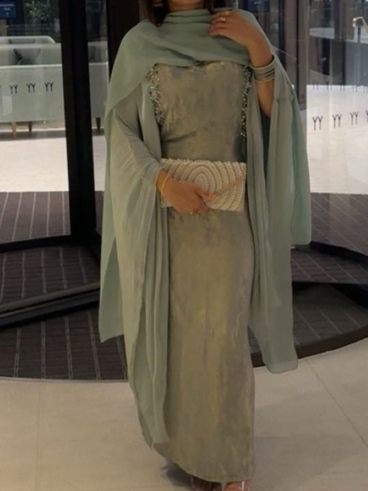 • Cape Layer – A flowing chiffon cape that drapes gracefully, creating an airy, ethereal silhouette with every movement.